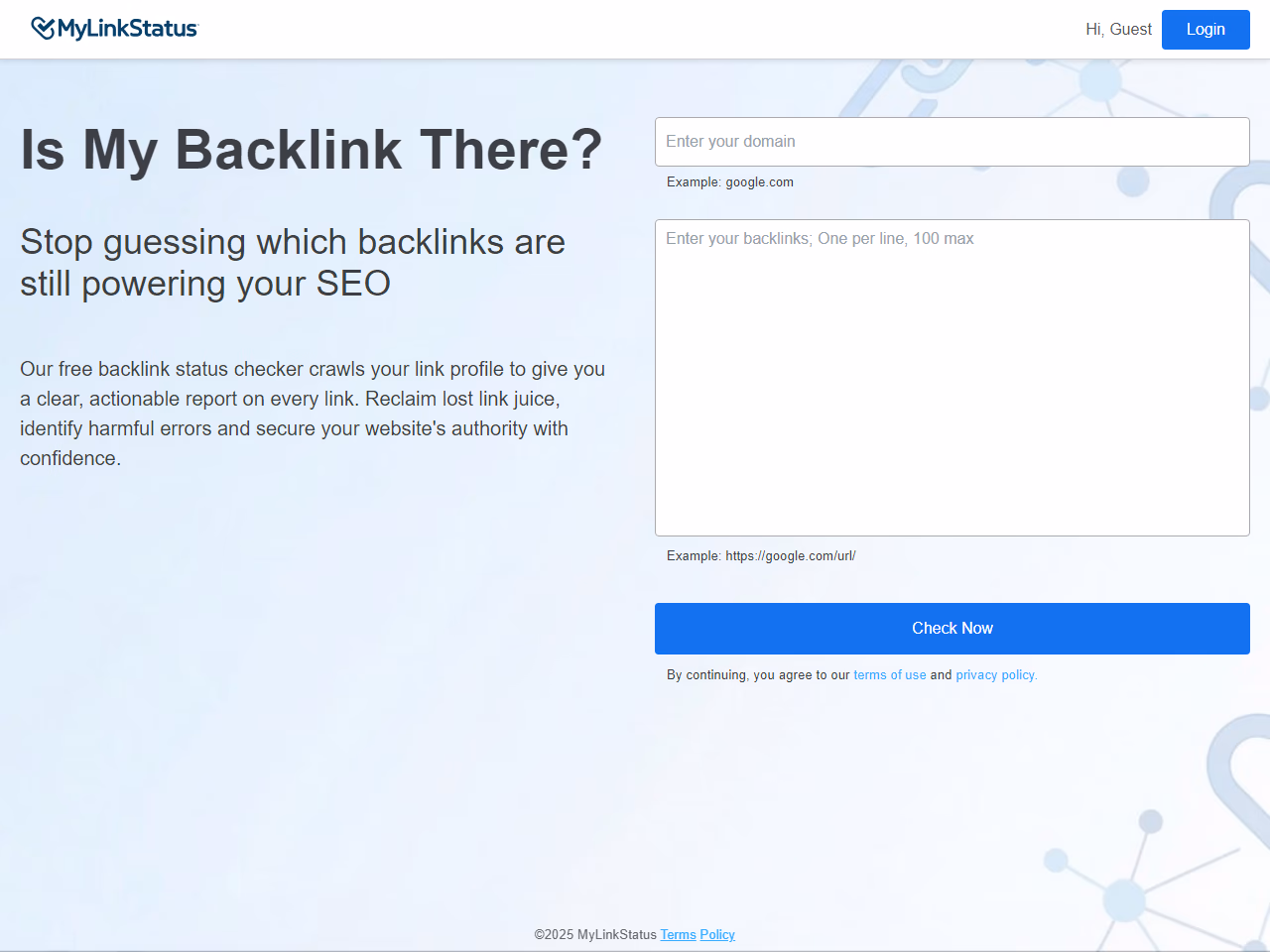 Click to view full sizeMyLinkStatus offers a free backlink checker tool designed to help users verify the status and effectiveness of their website backlinks. It provides reports that identify errors and issues with backlinks, allowing users to reclaim lost value and improve their SEO authority. By entering a URL, users can receive insights on which backlinks are functioning correctly and which may need attention. The tool aims to enhance SEO strategy by providing clear, actionable information about a site's link profile, ensuring that users can maintain and enhance their site's authority with confidence.