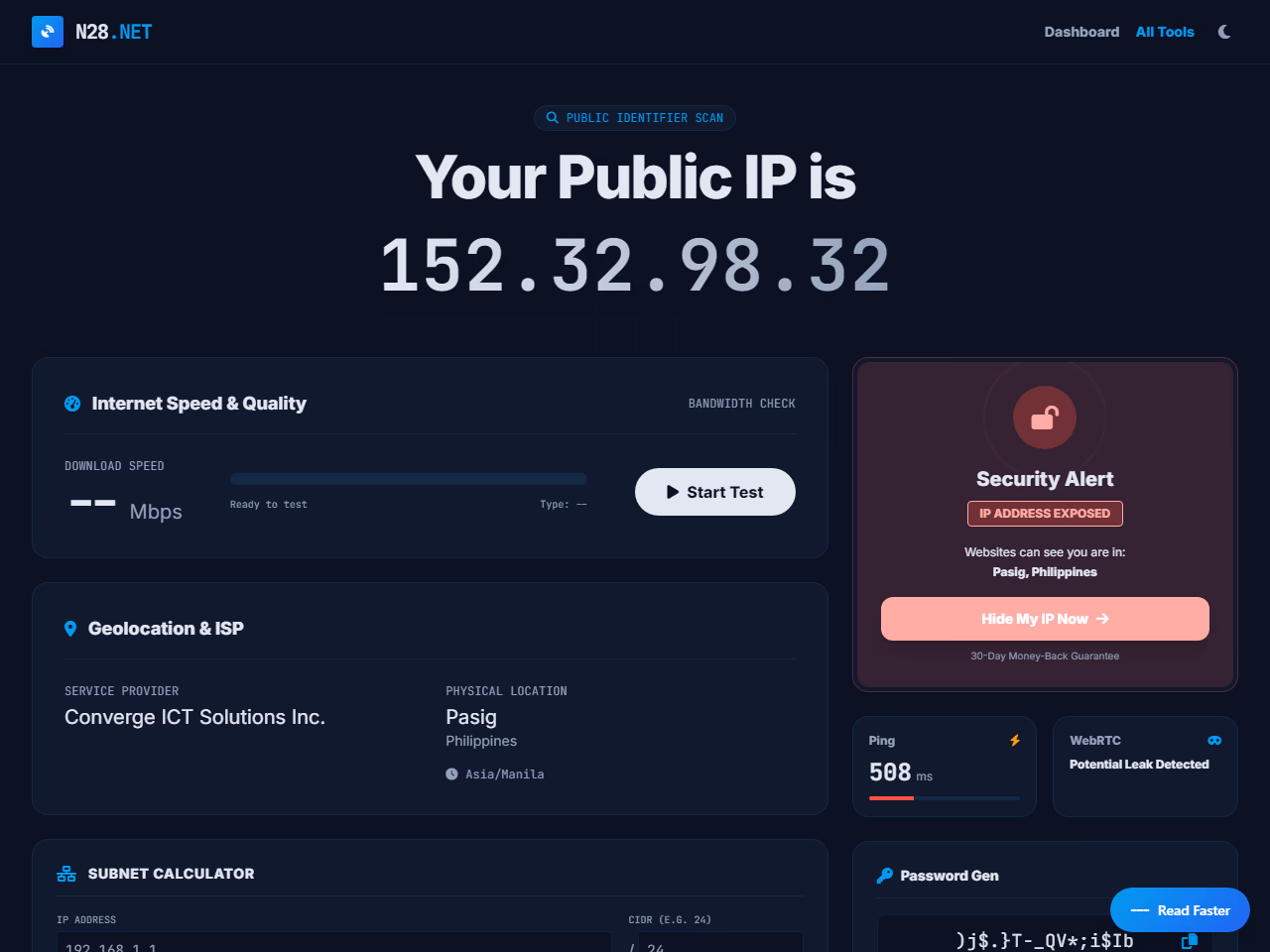 Click to view full sizeN28.net is a comprehensive network diagnostic and development toolkit designed to address a variety of online and local network needs. This all-in-one solution includes utilities such as a speed test to measure internet bandwidth, a subnet calculator for network addressing, and an IP check for public and local addresses. Privacy and security are key focuses, with tools for WebRTC leak detection and advanced IP and browser data analysis to ascertain what information your browser shares online. Developers can utilize the Base64 encoder for encoding tasks and a device fingerprinting tool to recognize unique device identifiers. Other features include advanced locational services, a password generator using secure, client-side technology, and a MAC address lookup for determining device manufacturers. N28.net ensures user data is handled privately, emphasizing a fast, free, and accessible service platform that aids both casual users and professional developers in managing network performance, privacy, and security efficiently.