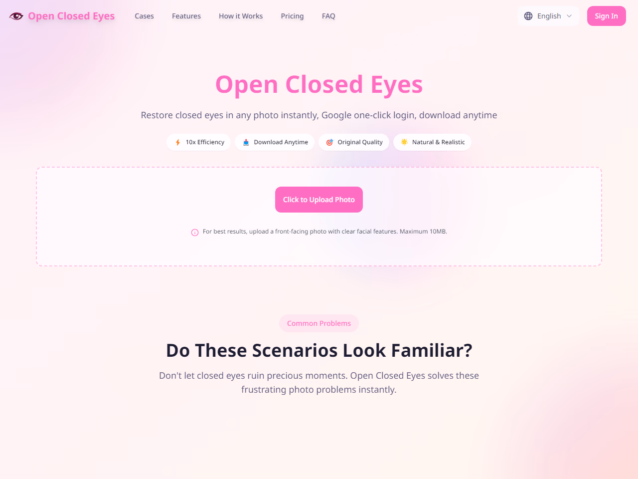Click to view full sizeOpen Closed Eyes is an AI-powered photo editor designed to transform closed-eye photos into natural, open-eye portraits without the need to retake pictures. Utilizing advanced AI technology, it automatically detects closed eyes, analyzes facial structure, and generates realistic open eyes that seamlessly match the original photo. This tool is particularly useful for fixing common photo problems in scenarios like group photos, travel pictures, and special occasions where retakes are impractical. It promises to maintain the original quality of images without any distortion, providing faster and more accurate results than traditional photo editing tools like Photoshop. Users can access the service easily with Google one-click login and download their edited photos anytime, ensuring convenience and reliability.