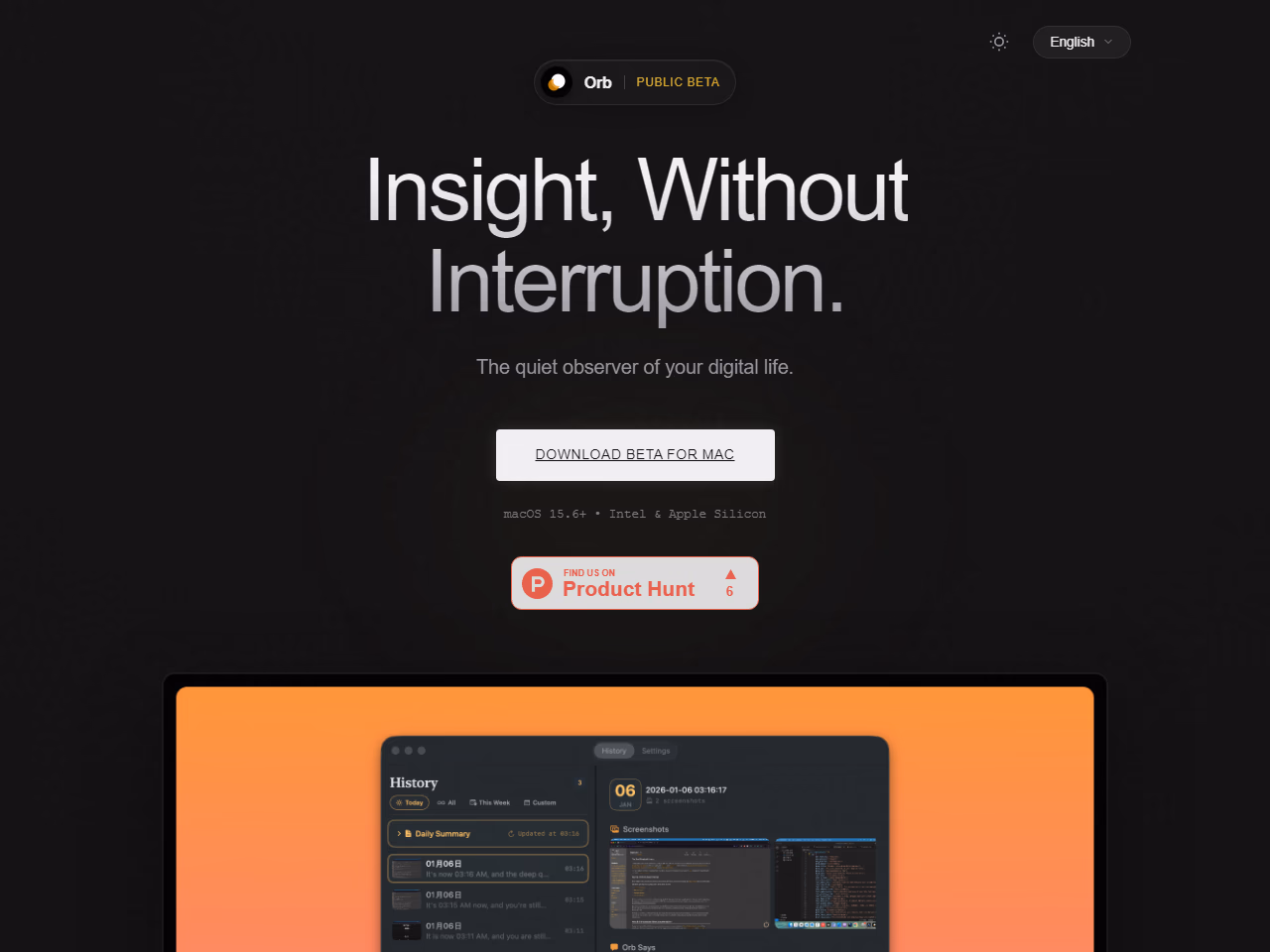 Click to view full sizeOrb is a macOS application designed to offer users insights into their digital activities without compromising privacy. It functions as a discreet observer of the user's screen, leveraging local-first AI technology to analyze context and deliver structured screen time insights. Orb offers features like Loop Mode, which captures screen data in specified intervals, and Daily Summaries that compile an overview of daily activities. The app emphasizes security and privacy, ensuring all data remains on the user's device, stored in a local database with no permanent server copies. Operating within macOS's security framework, it requires screen recording access only when in use. With multi-language support, Orb provides a seamless user experience across different languages.