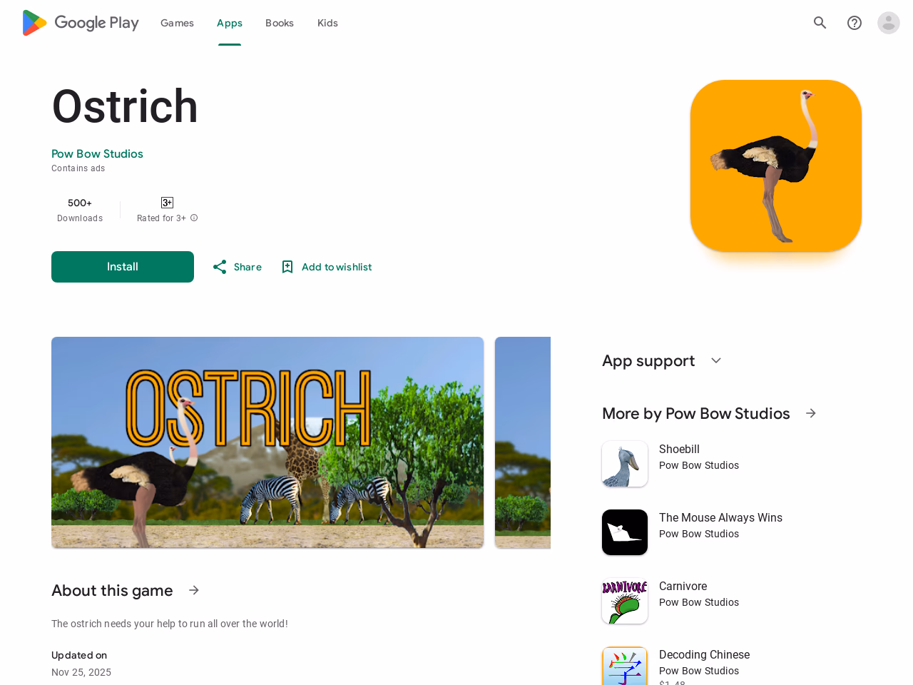 Click to view full sizeThe app 'Ostrich' is a game available on Google Play, developed by Pow Bow Studios. It is an action-based game where players assist an ostrich in running across various global locations. The game is designed for users aged 3 and up, and includes advertisements. Safety features indicate that no data is shared with third parties and data is encrypted in transit, although it cannot be deleted. The game achieved over 100 downloads and ensures user data privacy, with developers providing transparency regarding data collection. The game is formatted to be both engaging for children and compliant with Google's safety practices.