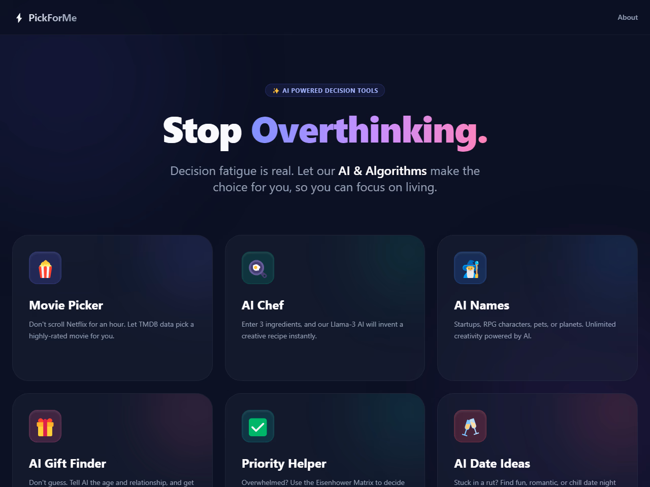 Click to view full sizePickForMe.help is a versatile platform offering AI-powered decision-making tools designed to alleviate decision fatigue and analysis paralysis. The website provides various utilities such as a movie picker using TMDB data for effortless choices, an AI cooking assistant generating recipes with simple ingredient inputs, and a name generator perfect for creative endeavors like startups or character creation. Additionally, it includes a gift finder that suggests ideal presents based on recipient details and a priority helper utilizing the Eisenhower Matrix for task management. The platform aims to simplify daily decisions, allowing users to focus on living more freely and intentionally. It's an ideal solution for those overwhelmed with choice, offering both practical and creative support.