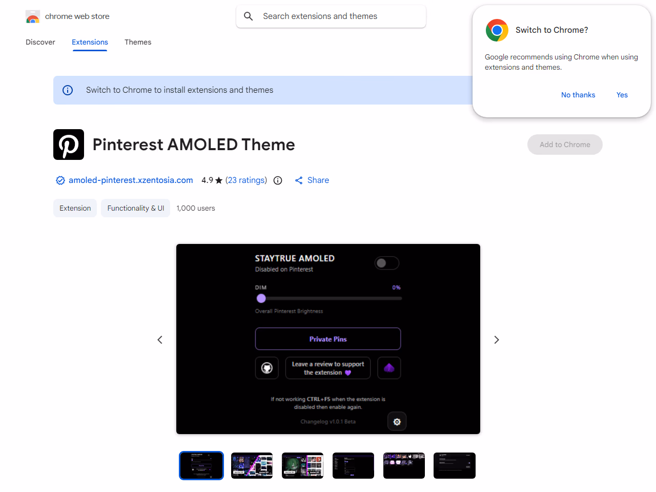 Click to view full sizeThe Pinterest AMOLED Theme is a Chrome extension designed to enhance the visual experience of Pinterest users by applying a pure AMOLED black theme. This tool ensures a fully black interface for Pinterest, aimed at users tired of the platform's traditional themes. It offers features like a private vault for pins, import and export options for locally saved pins, and a preview shortcut that enables bulk image previewing. It also includes custom tag functionalities, allowing users to organize their saved pins better. The extension is part of the StayTrue Project and is still in beta, inviting users to report any bugs or issues via GitHub or the Chrome Web Store. The developer emphasizes privacy, assuring users that their data is not collected or sold, and offers support through a dedicated hub. The extension is also available for Firefox users through the Firefox Add-ons site.