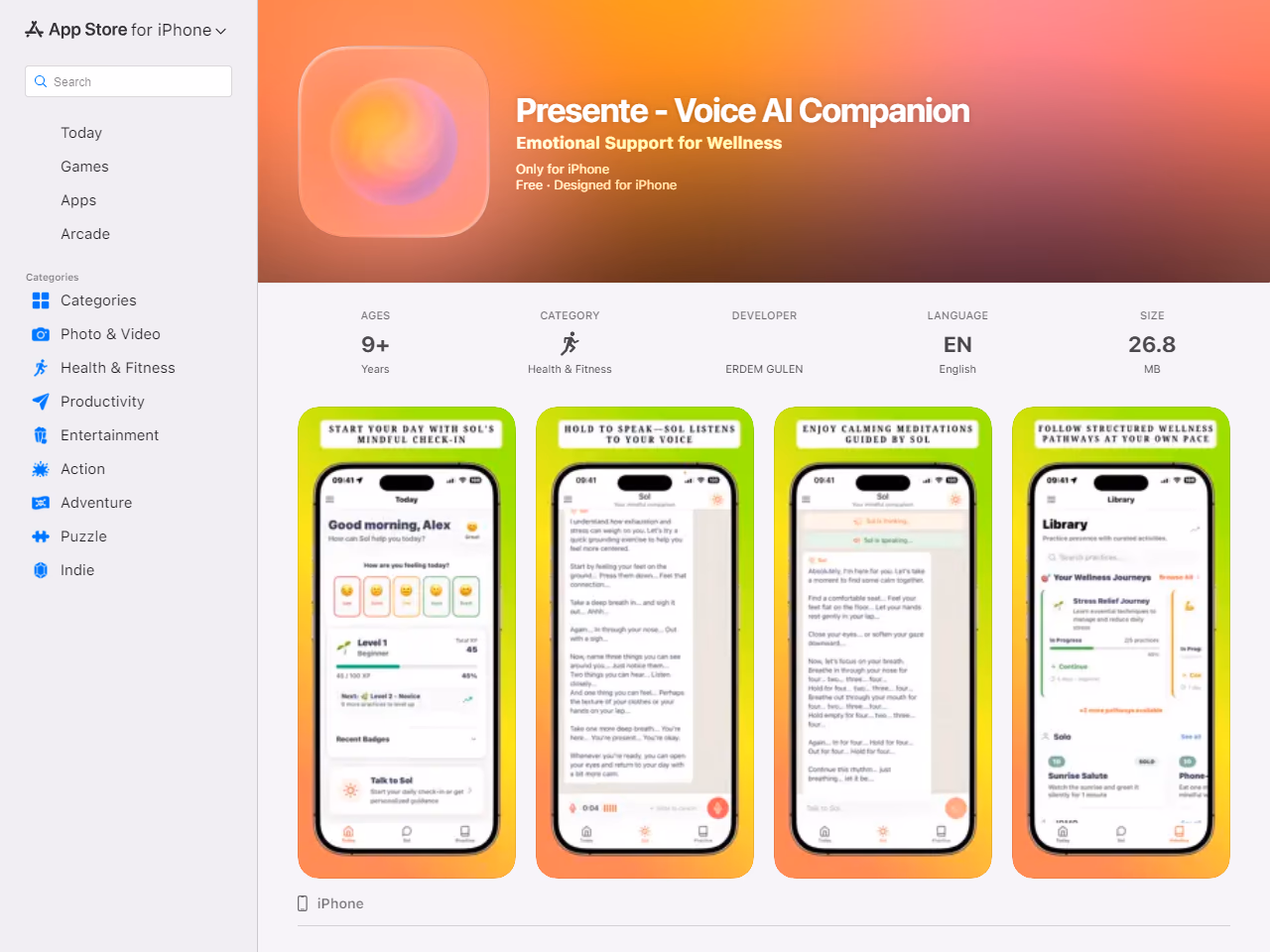 Click to view full sizePresente is a Voice AI Companion app focused on promoting emotional support and wellness. Designed for iPhone users, the app leverages AI technology to offer personalized guidance and support. Users can interact with "Sol," the AI component, for empathetic conversations that aid in managing stress, anxiety, and emotional well-being. The app offers structured wellness pathways such as stress relief and mindfulness journeys, which are crafted using evidence-based practices like Cognitive Behavioral Therapy (CBT) and mindfulness techniques. It includes over 50 exercises, meditations, and tips tailored to individual needs. Progress is tracked through visual indicators and personalized insights, fostering accountability and sustained personal growth. With a focus on privacy, the app ensures secure conversation handling, making it a reliable companion for daily mental health support.