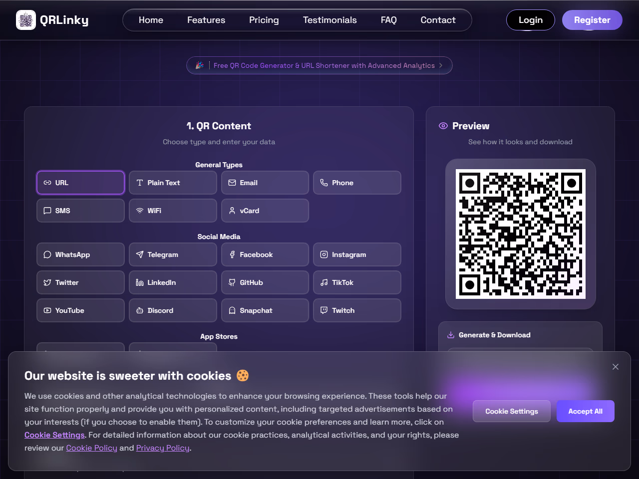Click to view full sizeQRLinky is a comprehensive platform offering free QR code generation and URL shortening services tailored for businesses, marketers, and developers. It enables users to create dynamic and customizable QR codes with features such as custom branding, logo integration, and color design. The platform also supports shortening of URLs and provides advanced analytics to track code and link performance. QRLinky facilitates professional solutions with its dynamic QR codes that allow changes without reprinting, and it supports seamless API integration for scalable use. The platform offers various plans including a free tier and paid options with additional features like extended analytics, bulk QR creation, and custom short URLs. Suitable for commercial and personal use, QRLinky ensures data security and provides real-time tracking capabilities, making it an ideal digital marketing tool.