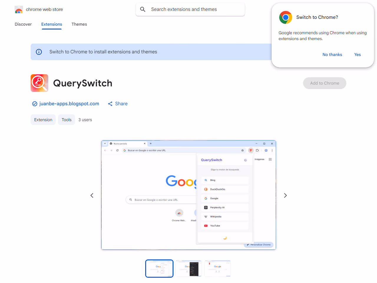 Click to view full sizeQuerySwitch is a Chrome browser extension designed to enhance and personalize your web search experience. It allows users to effortlessly switch between different search engines directly from the address bar using the keyword 'qs.' This tool caters to those who prefer flexible search options rather than being confined to one search engine. Users can select their preferred engine from a list, including AI-powered search engines, and seamlessly change it as needed. The extension offers features such as quick access to popular search engines, contextual search by selecting text, and a modern, user-friendly interface with light and dark modes. Additionally, QuerySwitch is free with advanced options available for those who wish to customize further by adding custom search engines. This flexibility and personalization aim to empower users to control how and where they search the internet.