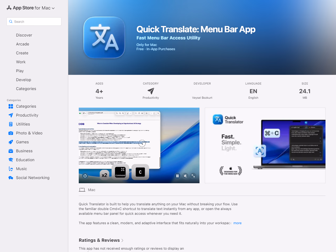 Click to view full sizeQuick Translate: Menu Bar App is a macOS application designed for users who require seamless and efficient translation capabilities within their workflow. Developed by Veysel Bozkurt, this utility is integrated into the Mac menu bar, offering instant access to translation services. Users can translate text immediately by using the familiar double Cmd+C shortcut from any application. The app simplifies the process with features such as automatic language detection, allowing users to bypass manual source language selection. Quick Translate supports both online and offline translation, ensuring functionality even without internet connectivity. The interface is clean and adaptive, supporting both light and dark appearances, which integrates smoothly into different work environments. It is suited for a range of tasks such as studying, coding, reading documentation, or quick messaging translations, optimized for enhancing productivity without disrupting the user's workflow.
