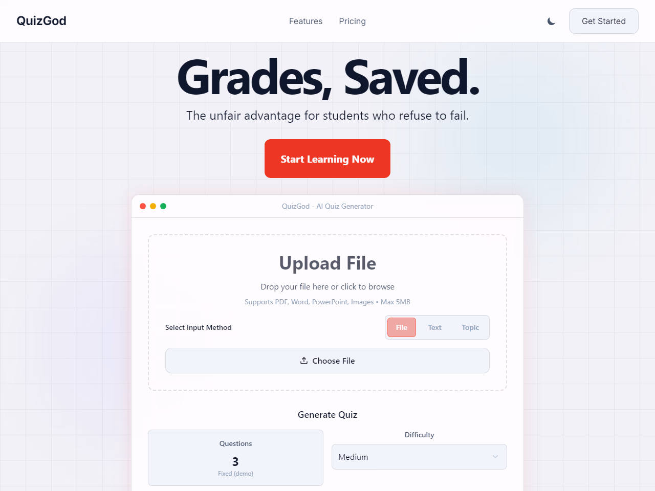 Click to view full sizeQuizGod is an AI-powered platform designed for students and educators to create, play, and share quizzes. It offers a user-friendly interface where users can easily generate quizzes by uploading files in various formats such as PDF, Word, PowerPoint, and images. The platform supports collaborative learning environments with features like class sharing and leaderboards, which can enhance student engagement and performance. QuizGod allows users to select difficulty levels for generated questions, catering to different learning needs. The service aims to provide an organized, efficient learning experience and serves as a valuable tool for both educational institutions and individual learners.