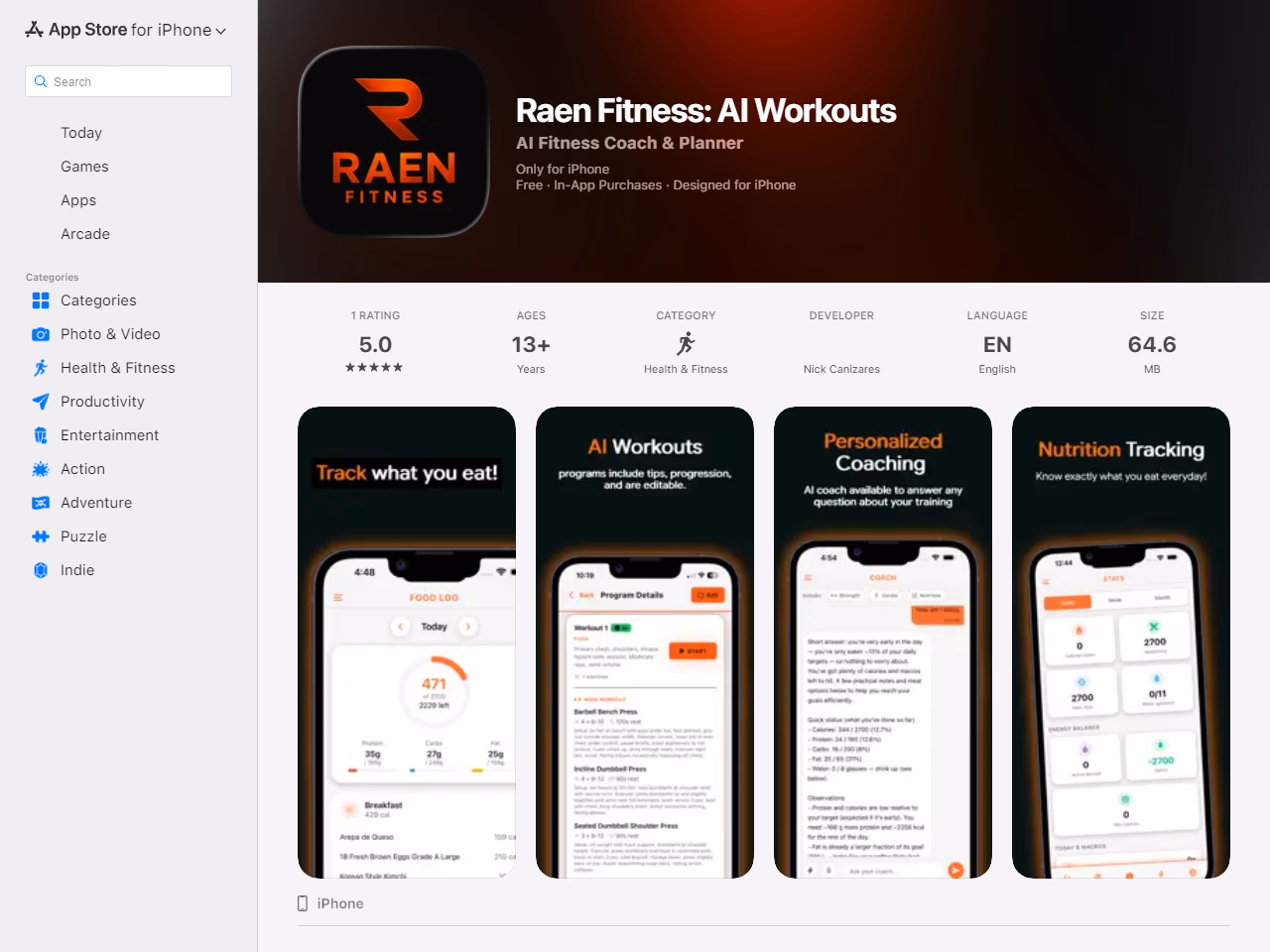 Click to view full sizeRaen Fitness is a mobile application designed for iPhone users, providing an AI-powered fitness and nutrition coaching experience. This app offers personalized workout plans, including strength, running, obstacle course racing, and hybrid exercises, tailored to individual user needs through an adaptive 4-week program. It features comprehensive workout tracking with GPS and heart rate monitoring, alongside advanced analytics. Raen Fitness also includes AI-driven nutrition tracking with built-in recipe generation and coaching, enhancing users' dietary planning. The app integrates seamlessly with Apple Health, offering a gym-friendly interface with robust privacy controls. Designed for users 13 and older, Raen Fitness aims to promote smarter training, better nutrition, and stronger fitness results through a personalized experience that evolves with the user’s progress. In-app purchases provide access to Raen Fitness Pro features, contributing to more refined guidance and support.