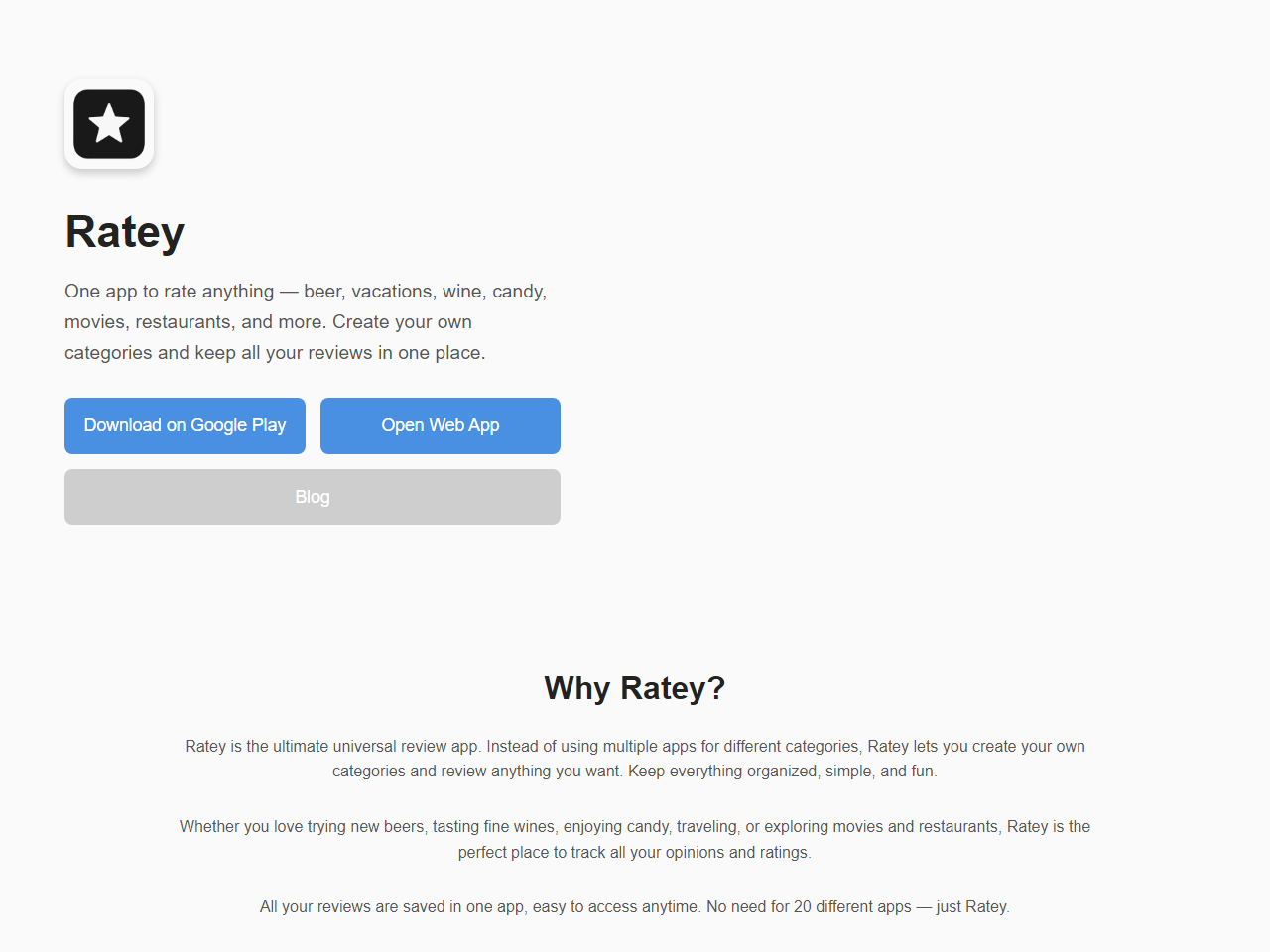 Ratey lets you rate anything in one place. From food and drinks to movies, trips, or anything else. Quick, easy, and perfect for keeping track of what you like (or don’t).
