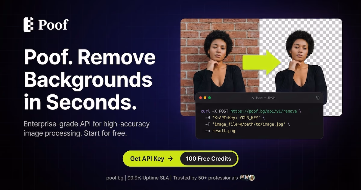 Click to view full sizePoof provides an AI-driven background removal API designed specifically for developers to integrate into various platforms such as SaaS and e-commerce applications. The service promises high precision and real-time processing at a cost-effective rate starting at $0.001 per image. Utilizing GPU-accelerated processing, Poof delivers results in under 5 seconds on average, with ultra-affordable pricing designed for scalability. The API is developer-friendly, requiring minimal code for integration and comes with comprehensive documentation, SDKs, and support for multiple languages including Python, Node.js, and PHP. Poof supports high-resolution images (up to 36 megapixels) and various file formats such as JPG, PNG, and WebP. It offers transparent pricing with no hidden fees, various subscription plans, and a free plan with 100 initial credits. Poof ensures privacy by processing images in-memory and automatically deleting them post-processing. The platform is geared towards developers who require reliable, scalable, and precise background removal solutions with a 99.9% uptime SLA.