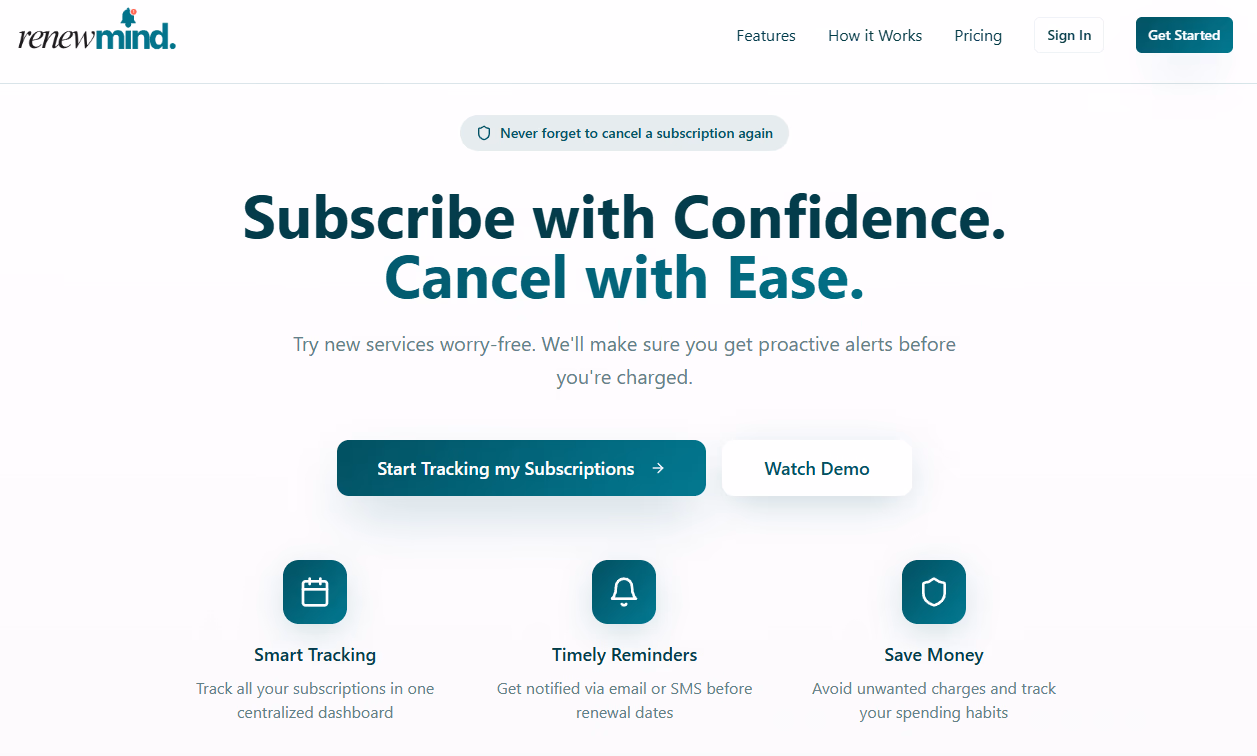 Click to view full sizeRenew Mind is a subscription management tool designed to help users keep track of their ongoing subscriptions and avoid unexpected renewal charges. The service offers smart tracking by consolidating all subscription information into a single dashboard, where users can manage renewal dates, costs, and service details. Users benefit from timely reminders through email or SMS, ensuring they are notified before any renewal charges occur, allowing ample time to cancel or modify services as needed. The platform also provides spending analytics, helping users understand their subscription expenses and identify potential savings. Renew Mind prioritizes security and privacy, encrypting all personal data and ensuring it is not shared with third parties. The tool is easy to set up, requiring minimal input from the user to begin tracking subscriptions effectively. Flexible pricing plans cater to various user needs, from free basic tracking to comprehensive management features.