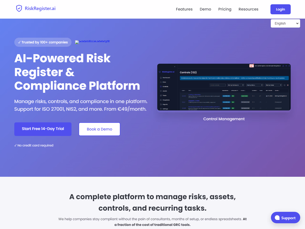 A platform to manage risks, controls, evidence and ISO/NIS2 reporting with AI help.