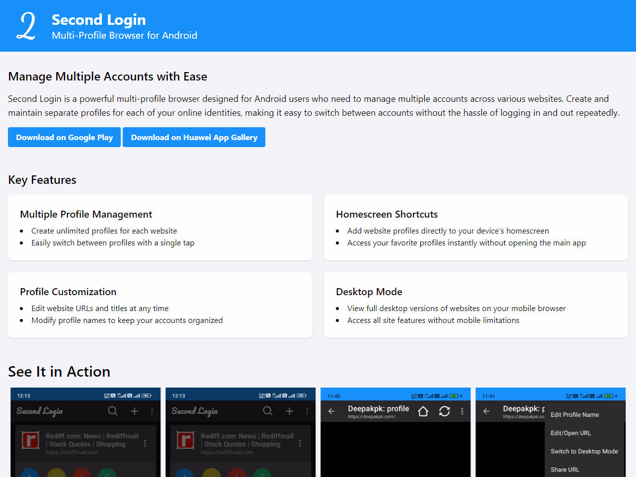 Click to view full sizeSecond Login is an Android-based multi-profile browser designed for users who need to efficiently manage multiple online accounts. It allows users to create and switch between unlimited profiles across various websites seamlessly, eliminating the need to log in and out repeatedly. Key features include the ability to add website profiles directly to the device's homescreen for quick access, customize profile details, and view desktop versions of websites from a mobile device. Second Login is particularly beneficial for social media management, e-commerce activities, email handling, and content creation. It also serves well for developers and testers who require multiple user profiles to simulate different conditions. This versatile browser adapts to various needs such as freelancing, gaming, and more.