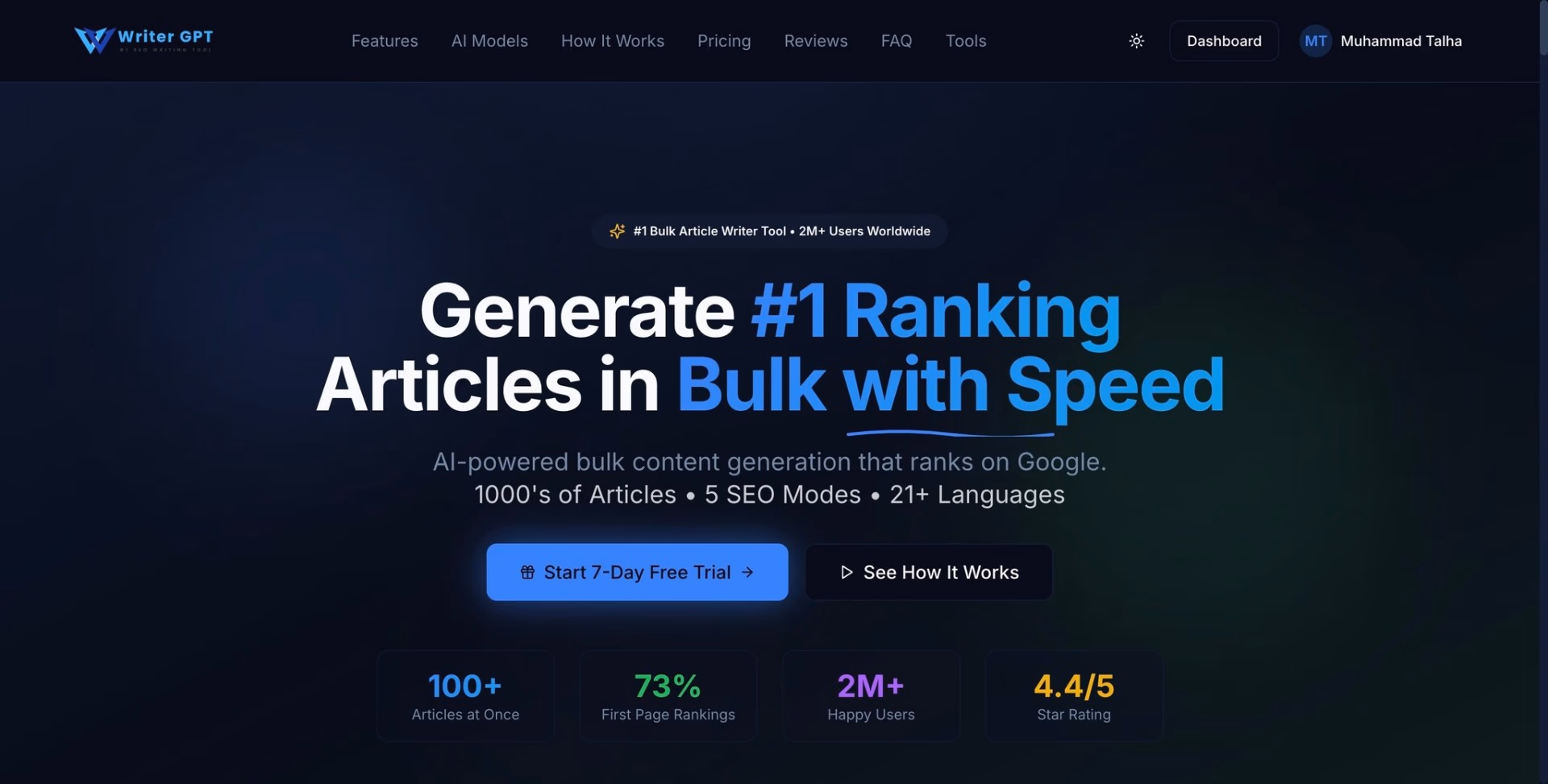 Generates bulk SEO articles from keywords with modes, exports, and CMS publishing.