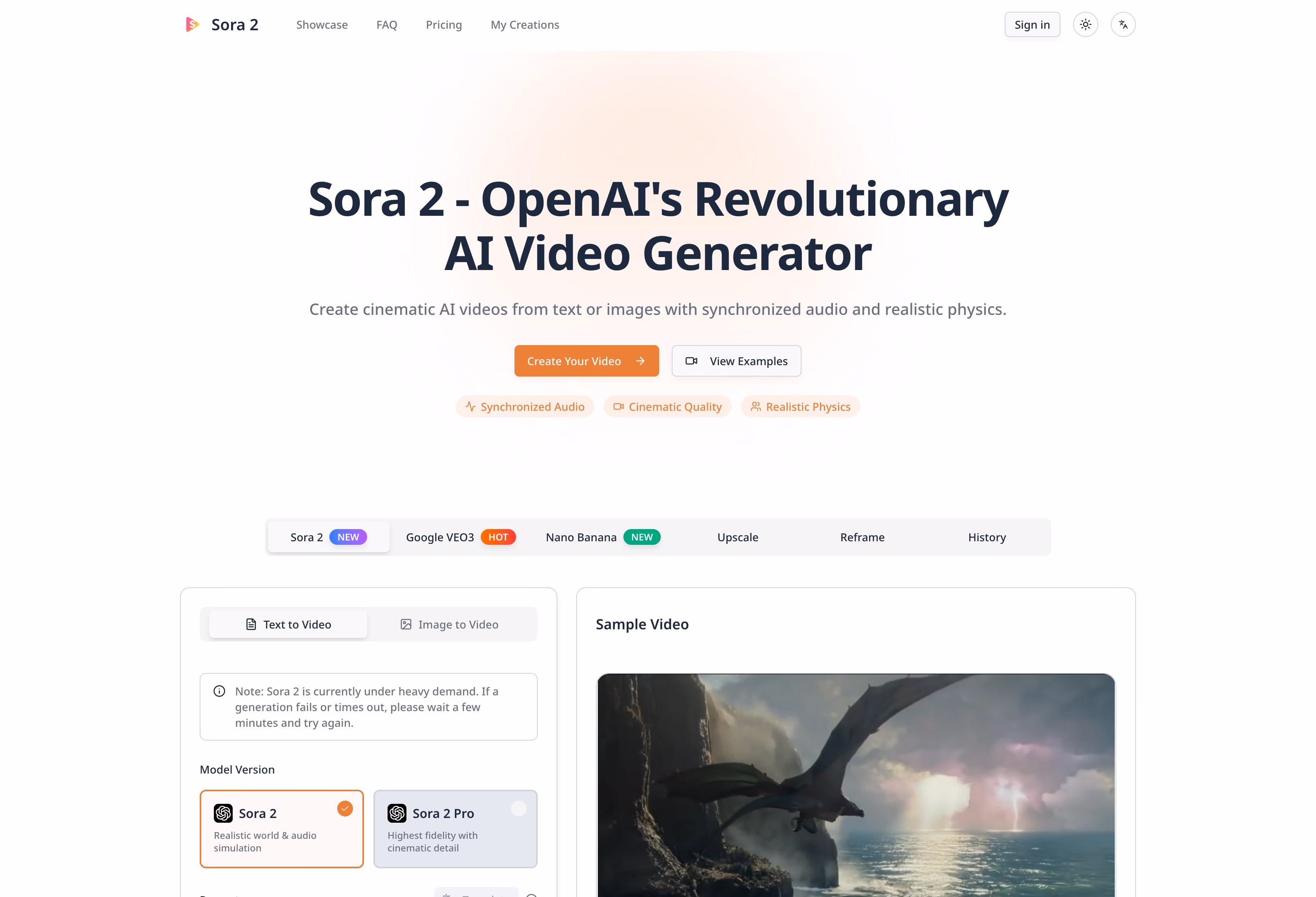 Click to view full sizeSora 2 is a web-based AI video generator positioned as OpenAI’s latest video model. It lets users create cinematic videos from either text prompts or images, with audio generated to match the visuals. The site emphasizes synchronized dialogue, sound effects, and ambient audio, along with realistic physics so objects move and interact naturally. It also highlights advanced control for multi-shot sequences, aiming to keep a consistent world state across scene changes and camera angles. A featured capability called Cameos allows users to insert themselves or others into generated videos using a one-time video and audio recording for identity verification, enabling appearance and voice reproduction. The site includes a showcase of example prompts, plus pages for pricing, a user “My Creations” area, and FAQ and policy pages.