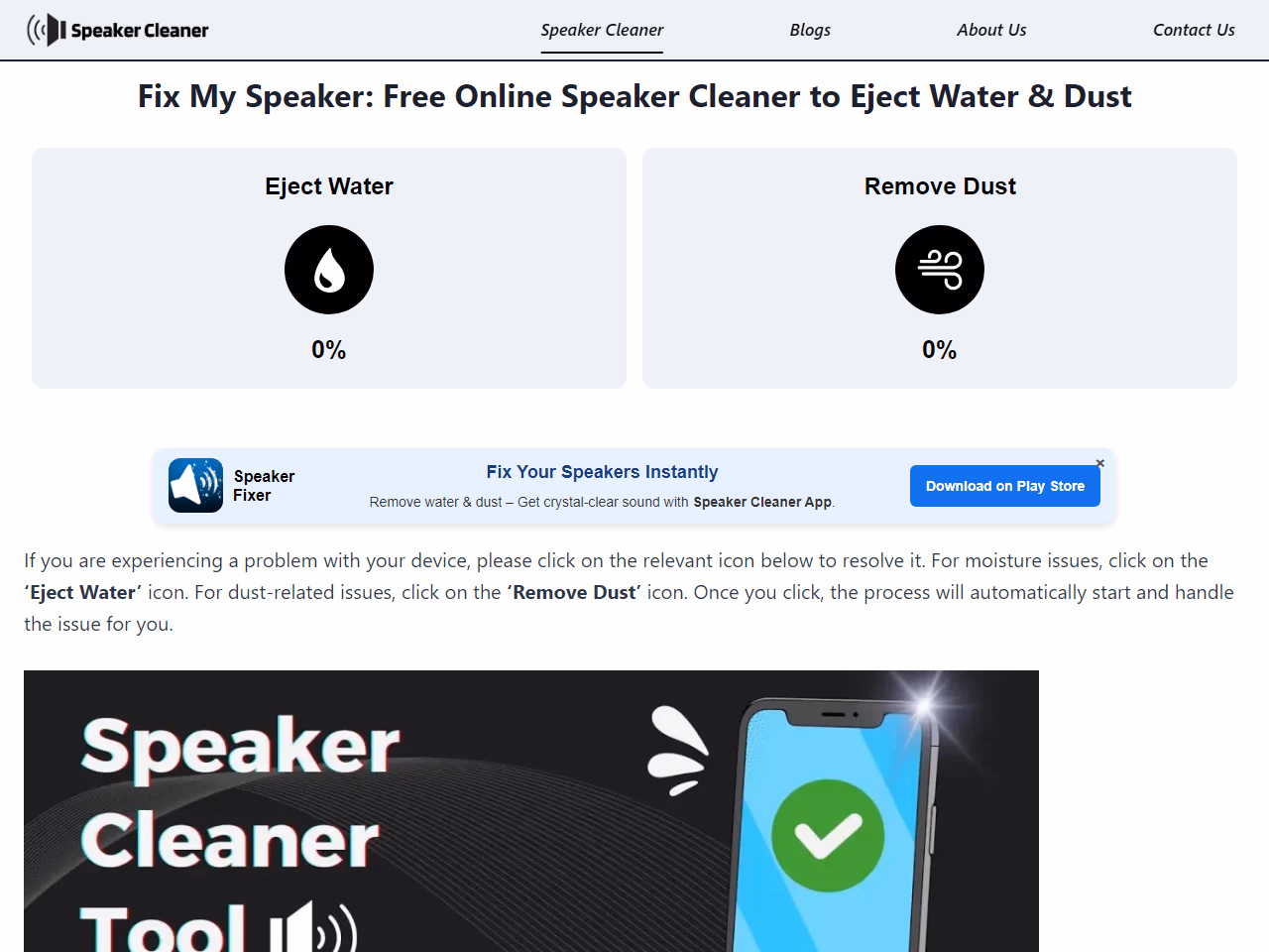 Click to view full sizeThe "Speaker Cleaner" is a web-based tool designed to address common audio issues in devices by using sound wave technology. It effectively removes dust and expels water from speakers, enhancing audio quality and preventing further damage. The tool operates by generating specific sound frequencies that create vibrations to dislodge dust and push out moisture. Designed for convenience, it is compatible with various devices, including smartphones and tablets, and requires no app download. Users can engage with simple controls to initiate cleaning, which improves sound clarity and device longevity. This tool is particularly useful for users experiencing muffled or distorted audio due to dust or water exposure. Its user-friendly interface makes it accessible for non-technical users, and its functionality extends beyond mobile devices, supporting a wide array of brands. Regular use of the Speaker Cleaner tool can prevent permanent speaker damage, leading to cost savings and prolonged device lifespan.