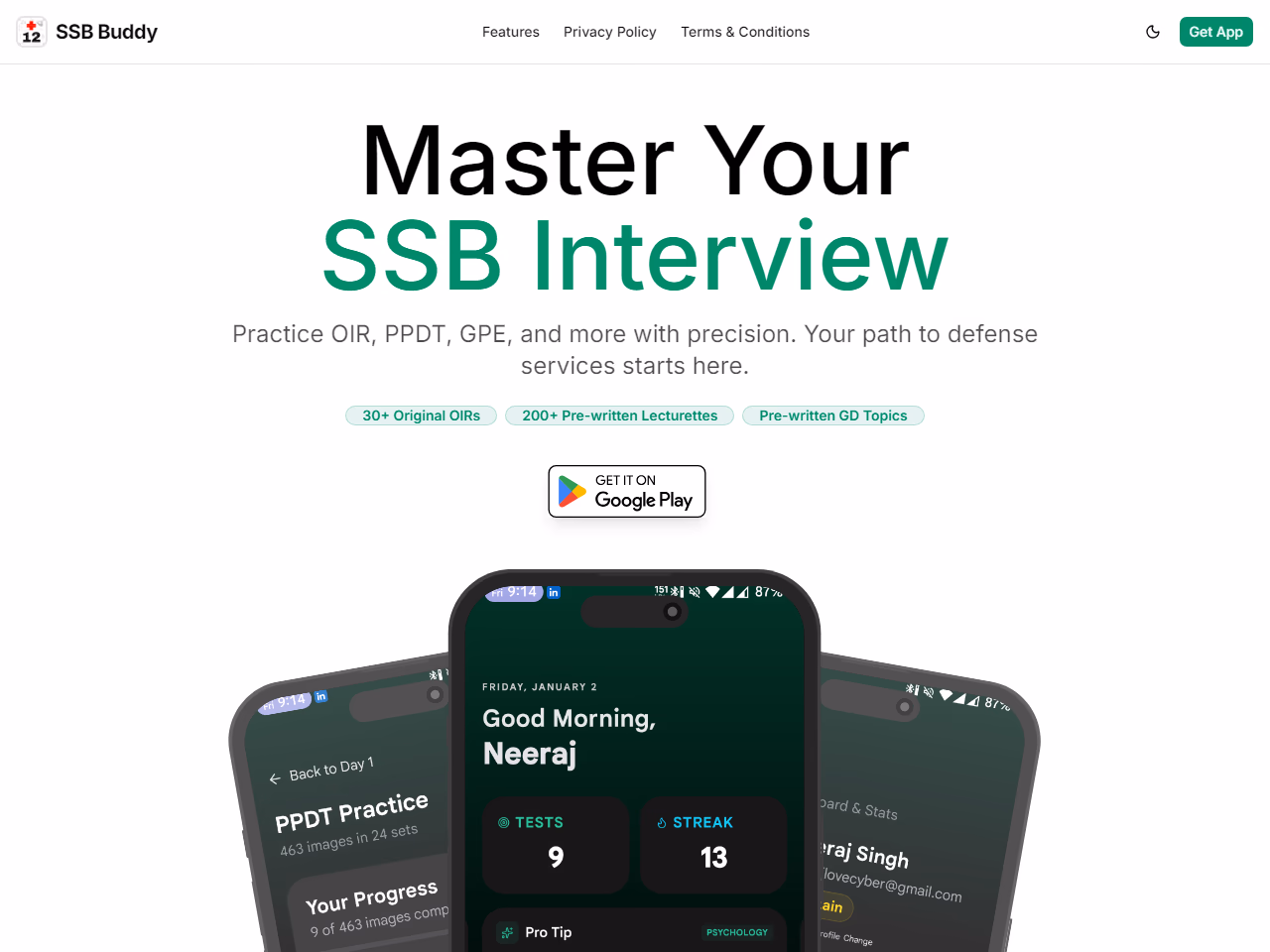 Click to view full sizeSSB Buddy is a comprehensive preparation tool designed for candidates aspiring to join defense services through the Service Selection Board (SSB) interview process. It offers a wide array of resources and tools to improve performance in various stages of the SSB interview. The platform provides over 30 original Officer Intelligence Rating (OIR) practice sets, 200 pre-written lecturette topics, and extensive preparation materials for Picture Perception and Discussion Tests (PPDT), Thematic Apperception Tests (TAT), and Group Planning Exercises (GPE). Users can benefit from interactive tools for group discussions and tracking their progress with visual analytics. SSB Buddy incorporates a gamified learning experience, allowing users to earn experience points, track daily streaks, and unlock achievements, all while progressing through military ranks. It is specifically tailored to meet the unique requirements of the SSB interview, providing structured practice sessions and ensuring a focused, distraction-free study environment. This tool is accessible with no subscriptions or hidden fees, encouraging aspirants to advance on their path to military service.