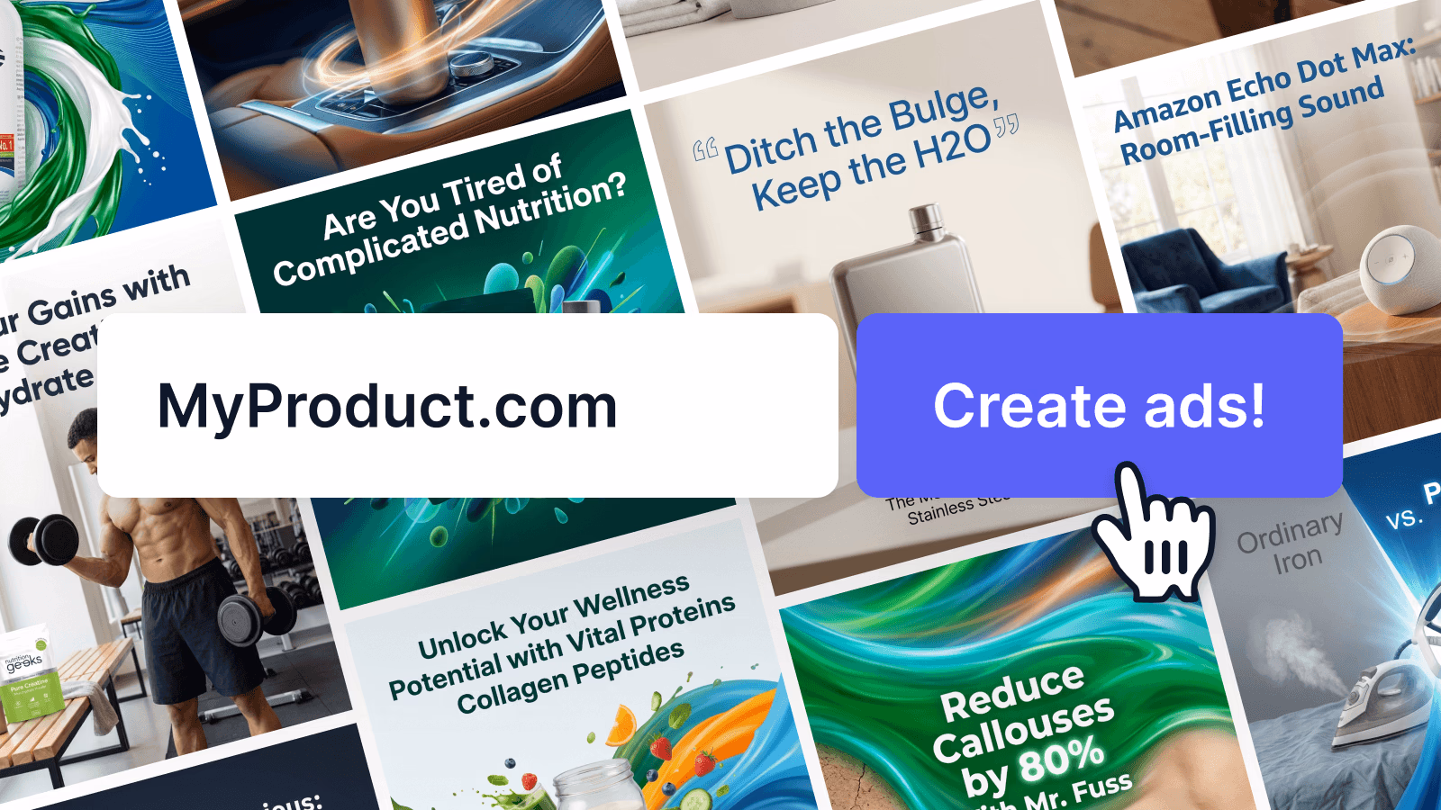 Creating ad creatives and captions is slow, costly, and needs design/copy skills.