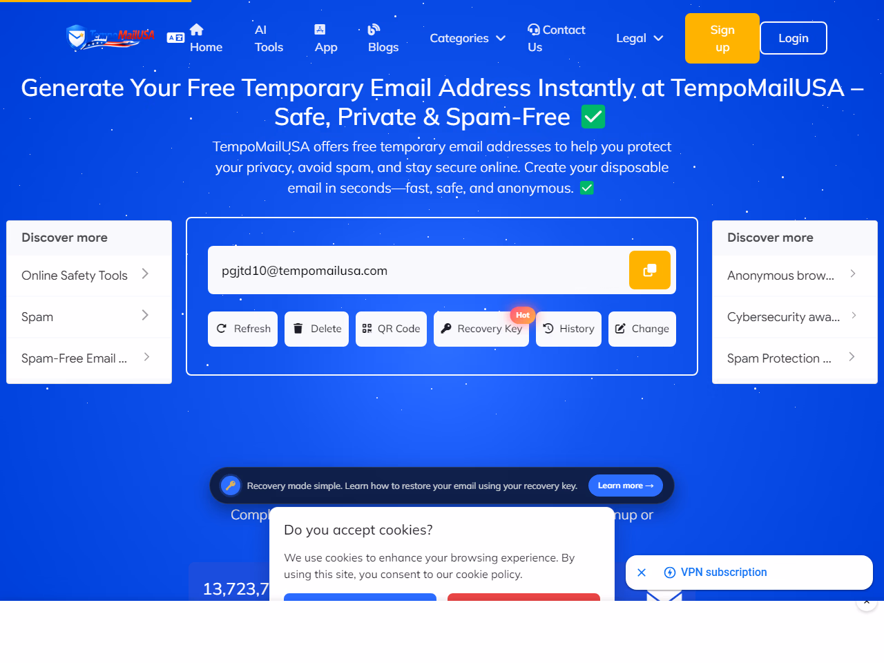 Click to view full sizeTempoMailUSA is a service providing free temporary email addresses aimed at enhancing online privacy and minimizing spam. It allows users to create disposable email addresses quickly, helping them to protect their personal information when signing up for online services. The platform requires no registration, offering anonymous and secure inboxes for short-term use. Key features include instant email generation, custom domain selection, and a unique recovery key system for re-accessing emails. TempoMailUSA targets individuals seeking to avoid aggressive marketing tactics by maintaining separation between their real email addresses and public-facing activities online. The service employs an advanced proxy-email architecture to block data harvesting and limit exposure to threats like spam calls and marketing profiling.
