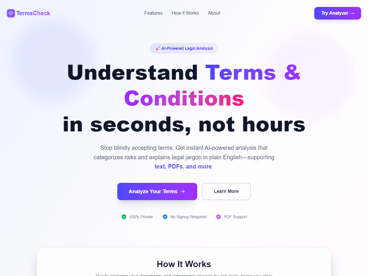 Click to view full sizeTermsCheck is an AI-powered tool designed to analyze terms and conditions documents quickly, providing users with a detailed and clear understanding of legal jargon and potential risks. The essential function of TermsCheck is to categorize different clauses based on their risk level, from critical threats such as data selling and unlimited liability to standard industry terms that require less attention. It supports various document formats, including text, PDFs, and DOC files, delivering instant insights without the need for a user account, thus ensuring privacy. By transforming complex legal language into plain English, TermsCheck empowers users to make informed decisions before accepting terms and conditions, reducing the likelihood of unforeseen legal consequences.