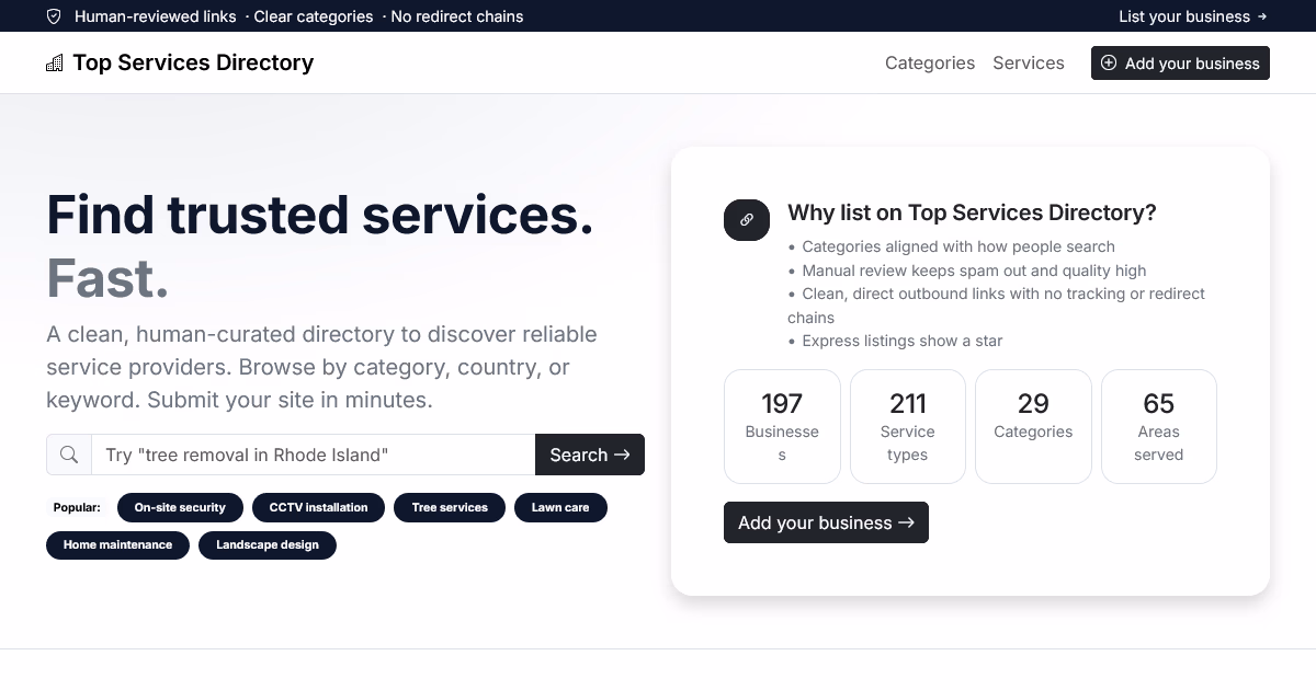 Click to view full sizeTop Services Directory is a comprehensive, human-curated online directory designed to help users find trusted service providers across a variety of categories and locations. The platform offers a clean and organized interface where visitors can browse services by category, country, or keyword. Key features include manual review processes that ensure high-quality listings, and direct, spam-free outbound links to service providers. Businesses can easily submit their sites to be included in the directory, reaching a wider audience. Categories span numerous sectors including automotive, legal, finance, wellness, and more, making it simple for users to find the services they need. The directory aims to facilitate fast and straightforward connections between consumers and reliable service providers.
