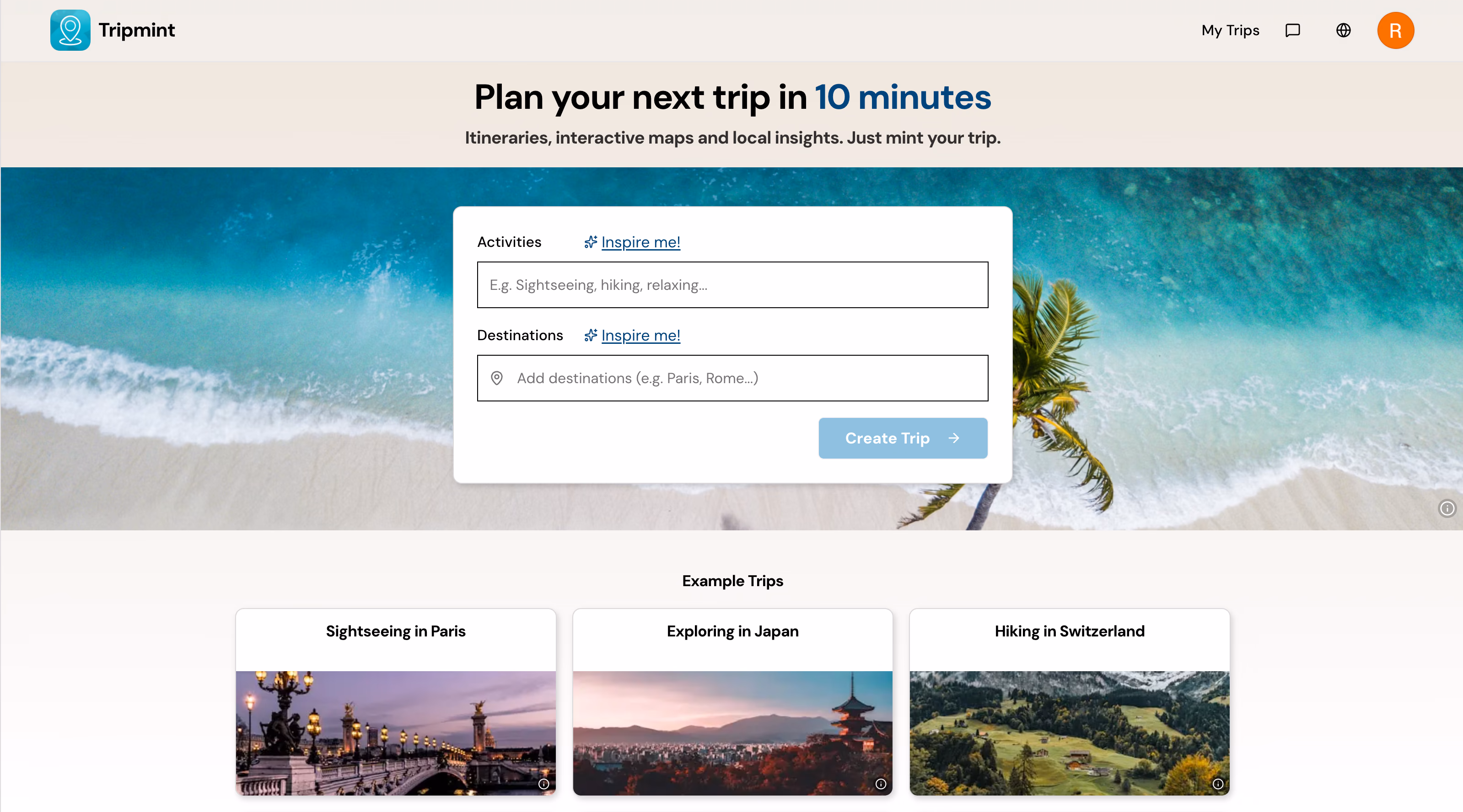 Click to view full sizeTripmint is an AI-powered travel planner that creates fully personalized itineraries in minutes. Instead of spending hours researching destinations, accommodations, and activities, users simply select their interests and destination—Tripmint generates a complete, interactive trip plan with maps, images, and local insights.