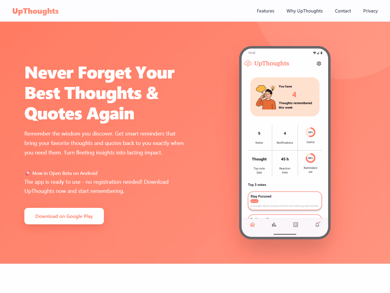 Click to view full sizeUpThoughts is an innovative mobile application designed to help users retain and recall their favorite quotes and thoughts. It offers smart reminders that bring these valuable insights back to users at optimal moments, enhancing memory retention through scientifically-proven spaced repetition techniques. Key features include quick capture of ideas from various sources, such as books or conversations, and personalized reminders tailored to individual daily rhythms. The app also provides a private memory vault, ensuring that user data remains secure and accessible only to them. UpThoughts is particularly beneficial for book lovers and those who wish to turn occasional inspirations into lasting habits, facilitating a more engaged and thoughtful lifestyle. Currently available in open beta for Android, the app requires no registration for use.