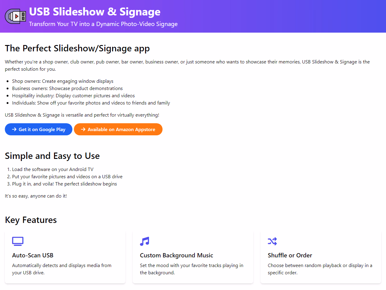 Click to view full sizeUSB Slideshow & Signage is an application designed to transform Android TVs and Amazon Fire TVs into dynamic photo and video displays. It primarily uses a USB drive or FTP upload to create engaging slideshows, making it ideal for various settings such as retail displays, business presentations, and personal photo showcases. Users can effortlessly plug in their media and enjoy customizable features such as background music, slide duration, and playback order. The tool offers easy navigation through remote controls and provides flexible subscription options to accommodate different user needs. Available on both Google Play and the Amazon Appstore, this solution simplifies the process of turning any TV into an interactive signage display.