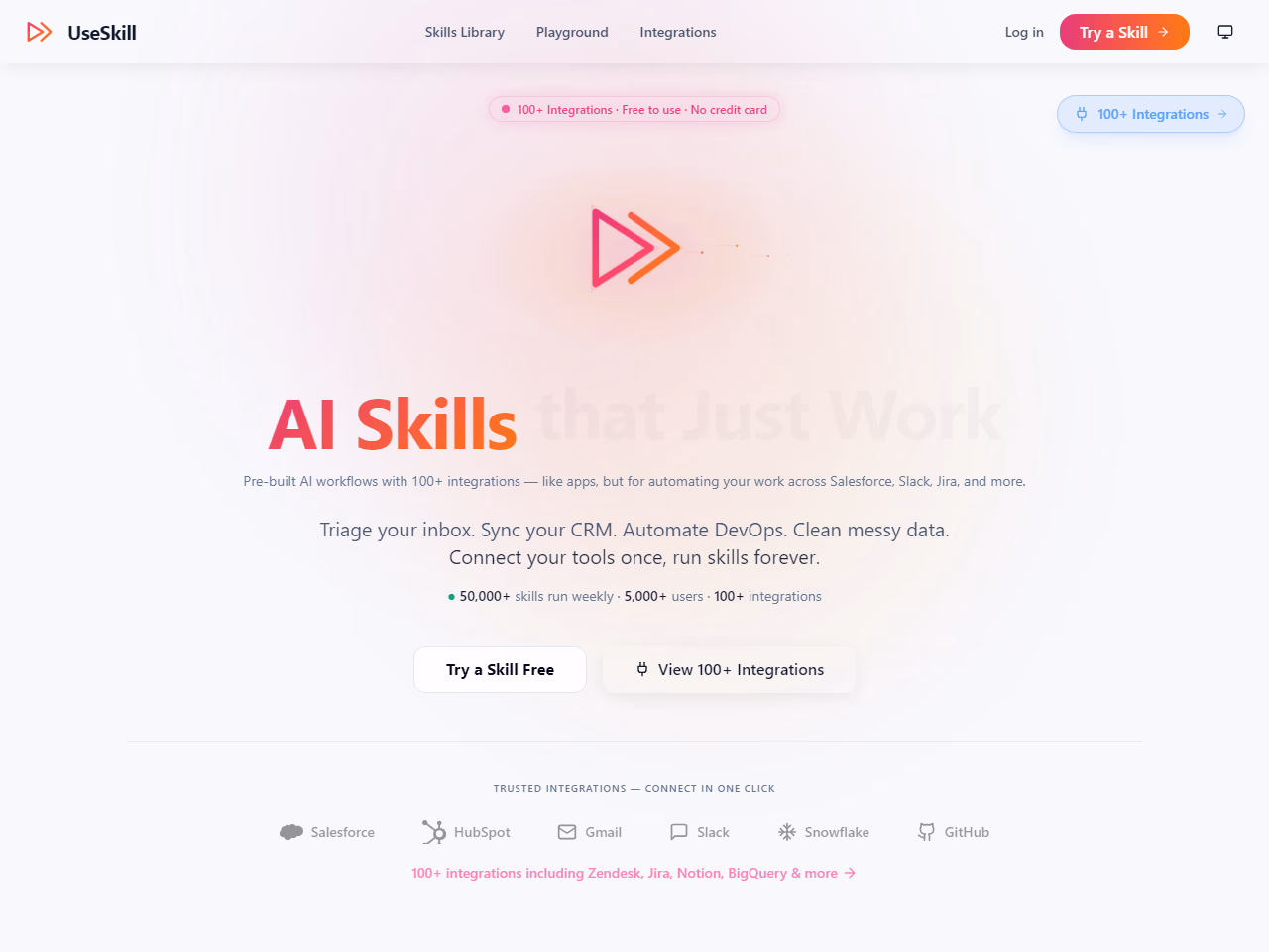 Click to view full sizeUseSkill is a versatile tool that allows users to run AI-powered skills on platforms like Gmail, Calendar, and Notion with minimal setup. It provides pre-built workflows designed to streamline tasks across various applications such as Salesforce, Slack, and Jira, helping users automate processes like inbox management, CRM synchronization, and data cleanup. The platform supports over 100 integrations and is trusted by more than 5,000 active users. UseSkill emphasizes security and privacy, utilizing OAuth 2.0 for secure connections without retaining user data. The tool delivers consistent results in just 30 seconds, making it ideal for individuals and teams looking to enhance productivity without technical hurdles. Users can try the skills for free, with a simple setup process that ensures quick and actionable outcomes.