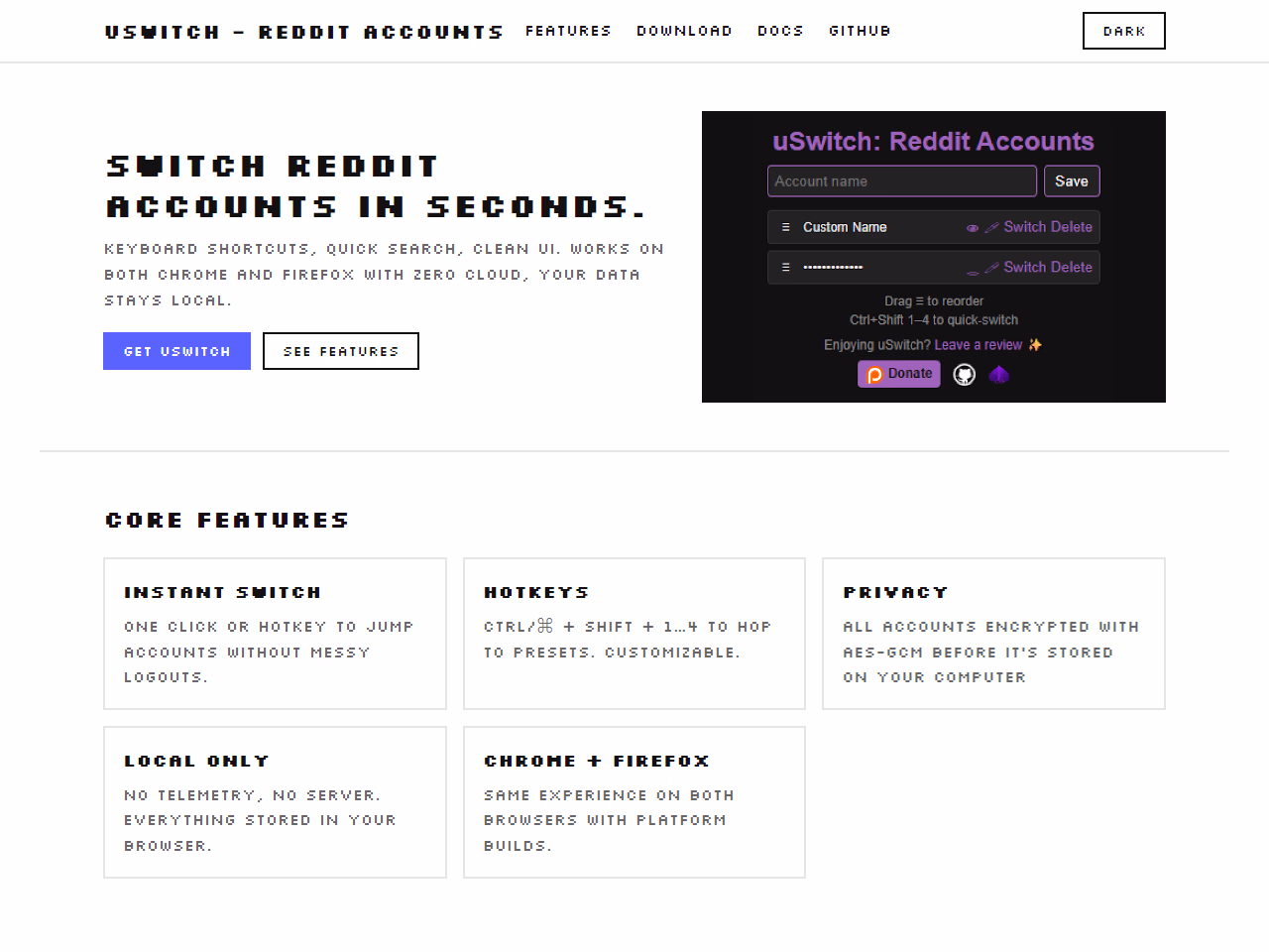 Click to view full sizeuSwitch is a browser extension designed for swift and seamless Reddit account switching, compatible with both Chrome and Firefox. It provides users with instantaneous account transitions via hotkeys or a single click, allowing them to switch between Reddit accounts without logging out. The extension focuses heavily on user privacy, employing AES-GCM encryption for storing accounts locally, ensuring data never leaves the user's device. Developed with a clean and intuitive interface, uSwitch enhances user interaction with keyboard shortcuts and quick search functionalities. Users can choose to install the extension from browser stores or manually through GitHub, where the source code and additional resources are available. This tool prioritizes efficient user experience across Chromium-based and Firefox-based platforms.