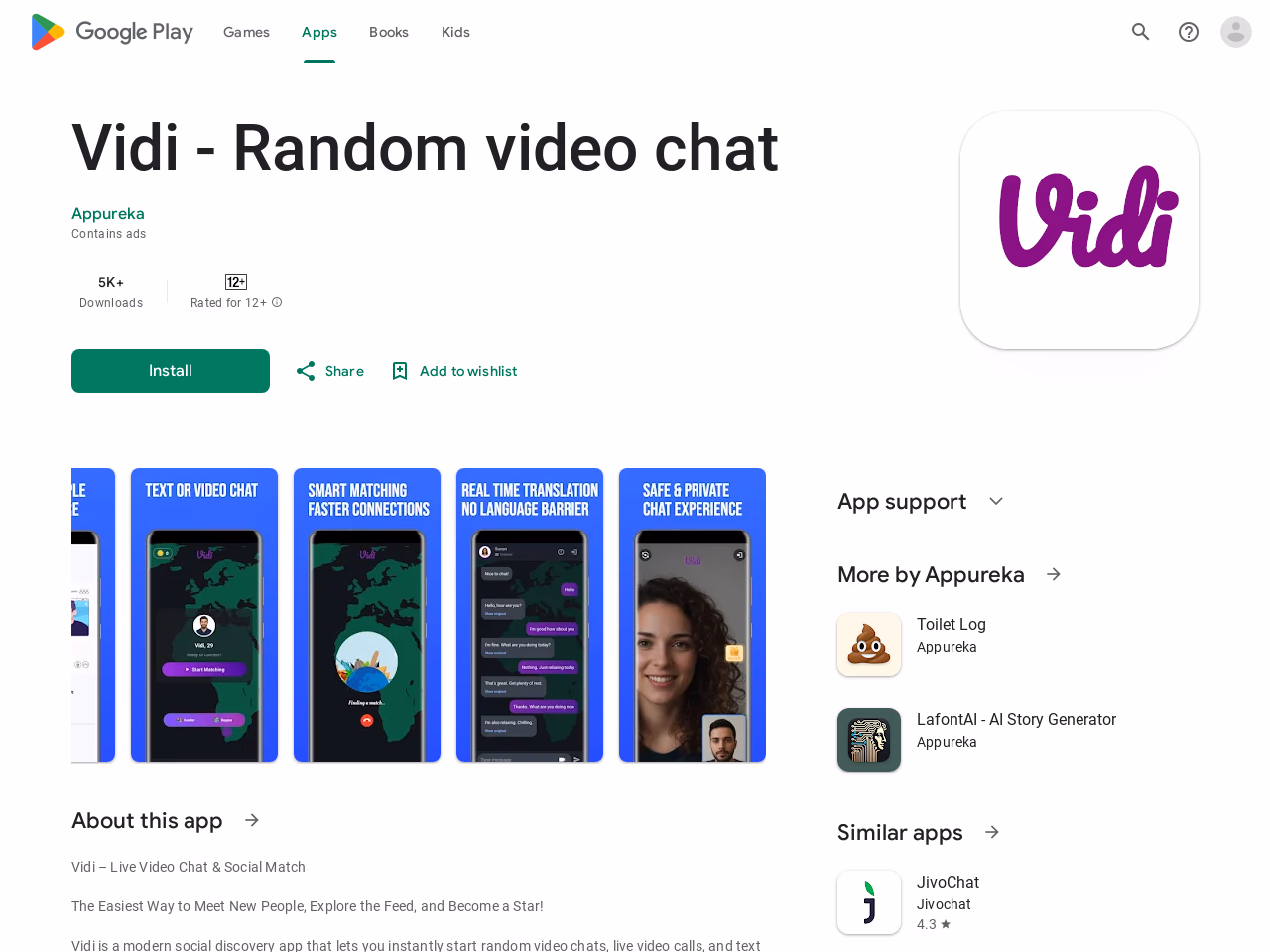 Click to view full sizeVidi is a social discovery app that facilitates random video and text chats with people worldwide. It combines elements of live video calls, instant messaging, and a social feed, allowing users to connect and share moments globally. With features like real-time translation, region and gender filters, and a smart matching system, Vidi aims to make meeting new people accessible and enjoyable. The app incorporates gamification through leaderboards and allows users to post photos and updates. Designed with safety in mind, Vidi includes real-time moderation and security measures to ensure a positive experience. The platform supports a global community from over 190 countries, making international communication seamless. Available on Google Play, Vidi provides an engaging way to explore new cultures and stories.