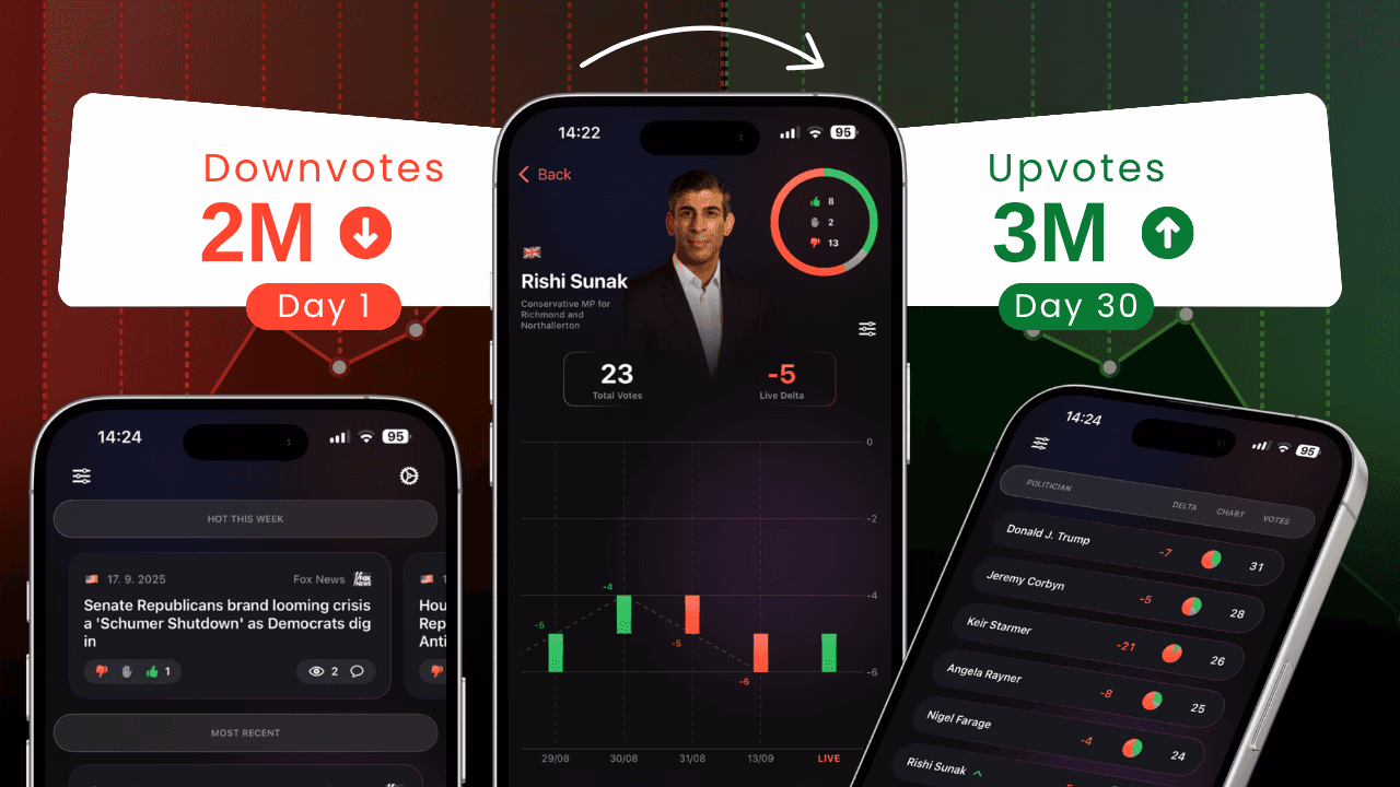 App enables daily voting and real-time charts showing politician trends and leaderboards.