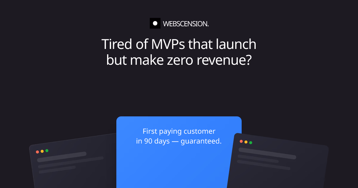 Click to view full sizeWebscension is a service aimed at helping startup founders turn their validated ideas into successful SaaS products with a focus on generating revenue. The offering guarantees that clients will secure their first paying customers within 90 days of launching their minimum viable product (MVP); otherwise, they receive a full refund. Founded by Imad Boukhari, who has successfully launched multiple profitable SaaS businesses, Webscension is not just about building an MVP but providing comprehensive business guidance and support. Services include feature prioritization, pricing strategies, and marketing, alongside technical development like authentication, payment integration with Stripe, analytics, and more. This ensures that the product is not only functional but well-positioned for the market. Targeted at founders seeking a reliable partner in their startup journey, Webscension offers a structured development process, ongoing support, and a focus on achieving early revenue, making it a compelling option for entrepreneurs looking to turn ideas into sustainable businesses.