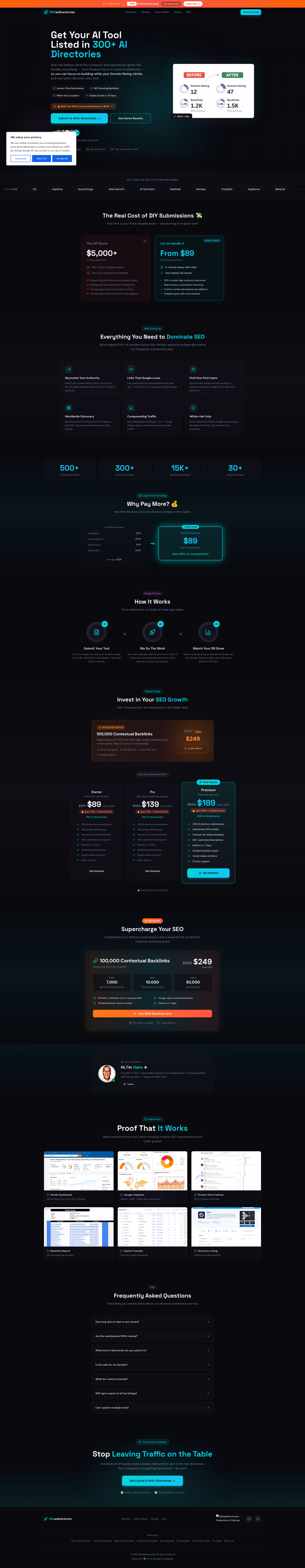 Click to view full size300aidirectories is a service designed to help AI tool developers enhance their online presence by manually submitting their products to over 300 high-authority directories. This process aims to boost the tool’s domain rating, provide valuable do-follow backlinks, and drive genuine traffic to the tool’s website. Customers can expect to see results, including increased domain authority and traffic, within 30-60 days. The service avoids automated submissions, ensuring compliance with white-hat SEO practices, and offers a comprehensive backlink report post-submission. Additionally, 300aidirectories provides an optional SEO boost package featuring 100,000 contextual backlinks to further amplify visibility. With various pricing plans to accommodate different needs, this service is trusted by numerous AI founders worldwide seeking to improve their tool's search engine optimization and discoverability in key directories like Product Hunt, G2, and Capterra.