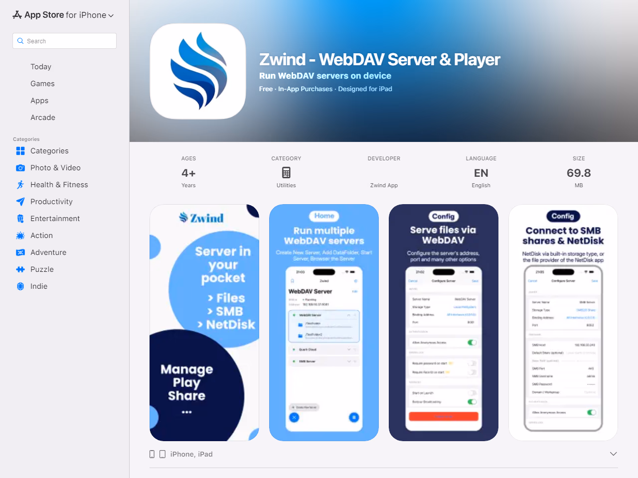 Runs WebDAV servers on iOS with mapping, file browser, and media player